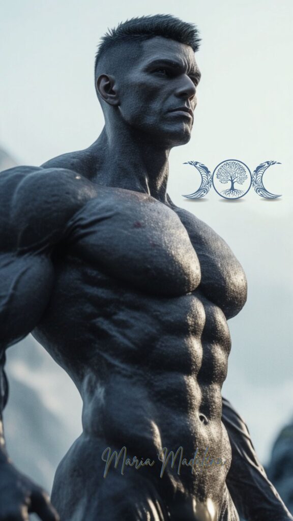 Corpo forte e definido: Músculos delineados e uma estrutura angulosa transmitem controle e firmeza.